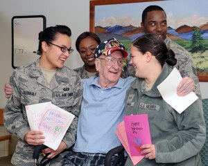 A total of 53 members from Altus AFB distributed Valentine's Day cards made by children from Rivers Elementary, Washington Elementary, Sunset Elementary, Will Rogers Elementary, the First Assembly of God, Altus AFB Child Development Center and Youth Center to veterans at several retirement