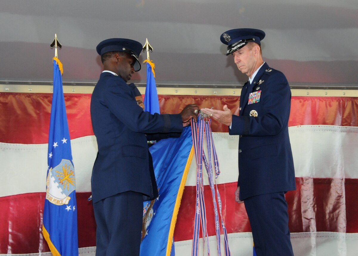 Maj. General Mark Solo (right), 19th Air Force commander, passes the 19th AF flag to Gen. Edward A. Rice Jr., Air Education and Training Command commander, to relinquish command during the inactivation ceremony held at Joint Base San Antonio-Randolph, Texas, July 12. (U.S. Air Force photo by Rich McFadden)