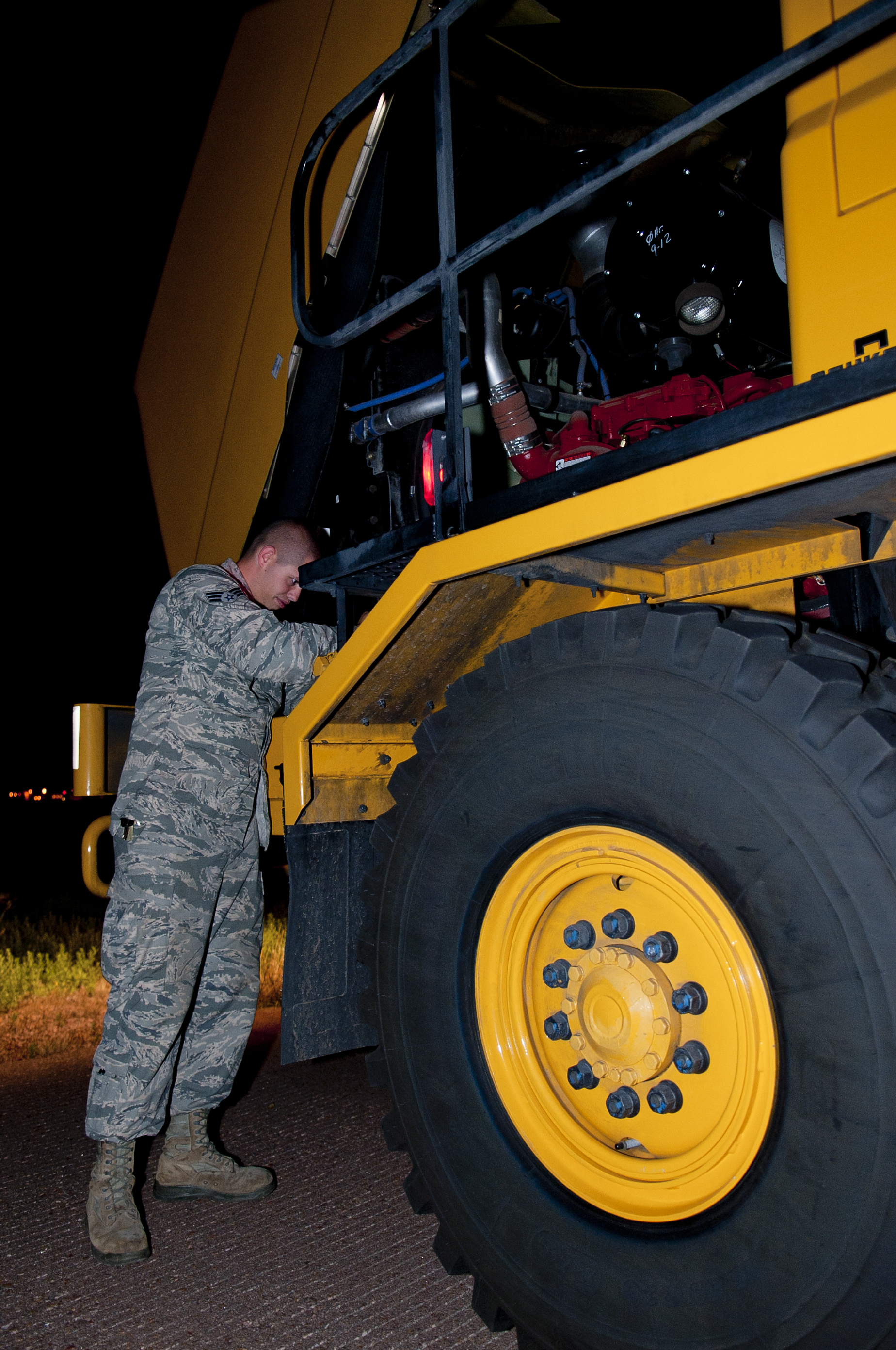 ALTUS AIR FORCE BASE, Okla. – U.S. Air Force Senior Airman Isaac Sutton, 97th Civil Engineer Squadron pavement and heavy equipment operator, guides a coworker into place before beginning rubber removal on the flightline here, Aug. 2. The 97th CES removes rubber from the flightline as needed to keep friction levels above the minimum to ensure safety for pilots and crew members. (U.S. Air Force photo by Senior Airman Dillon Davis/Released)