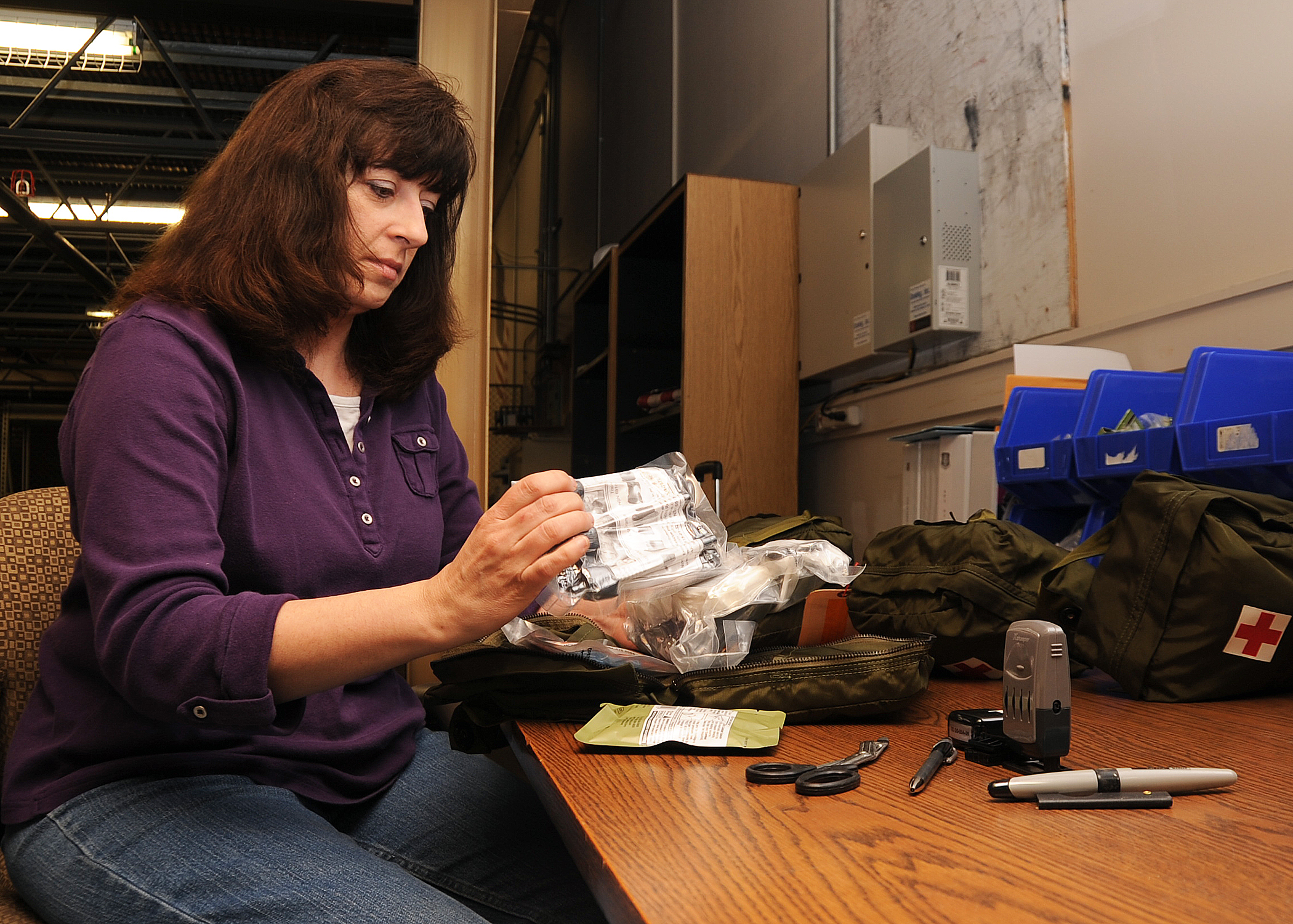 ALTUS AIR FORCE BASE, Okla. – Lori Jansen, 97th Medical Support Squadron material handler, checks first-aid kits in the medical logistics warehouse Jan. 31, 2012. The first-aid kits were being inspected for expiration dates and other defects to ensure they are always ready. (U.S. Air Force photo by Airman 1st Class Franklin R. Ramos / 97th Air Mobility Wing Public Affairs / Released)