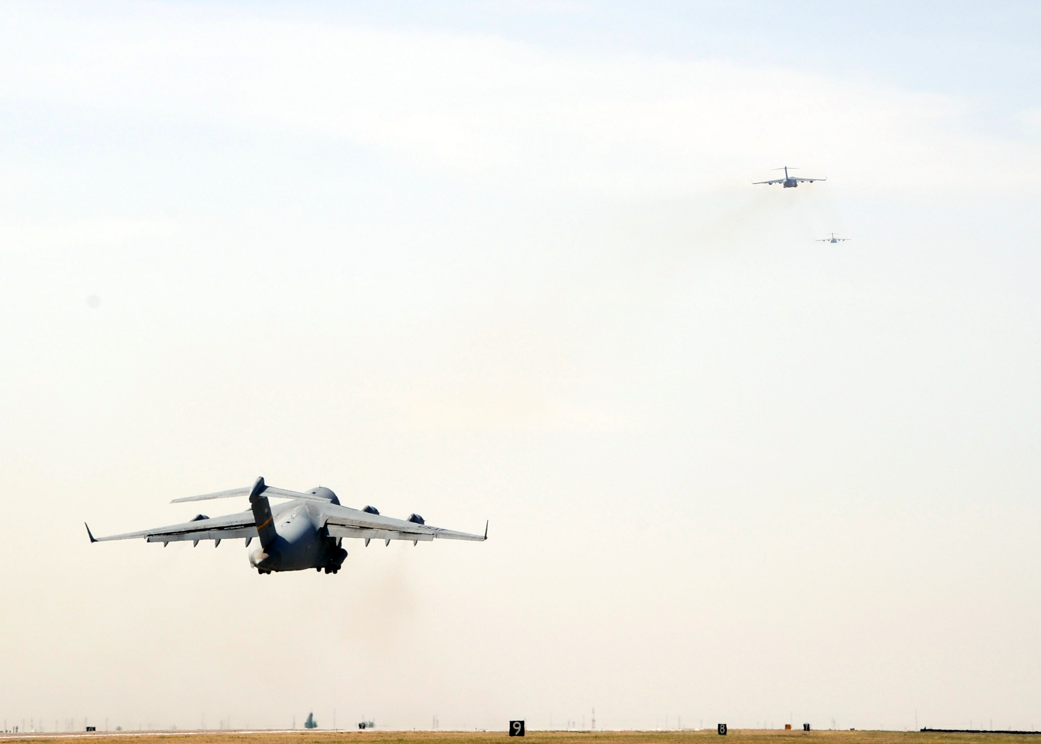 ALTUS AIR FORCE BASE Okla. – Three C-17 Globemaster IIIs take off for the Mobility Air Force Exercise May 18. Five C-17s and four KC-135 Stratotankers practiced executing airlifts and airdrops in medium threat environments as part of MAFEX, a biannual Air Force-wide training opportunity hosted by the Air Force Weapons School at Nellis AFB, Nev.(U.S. Air Force photo by Airman 1st Class Christopher Toon/97th Air Mobility Wing Public Affairs)