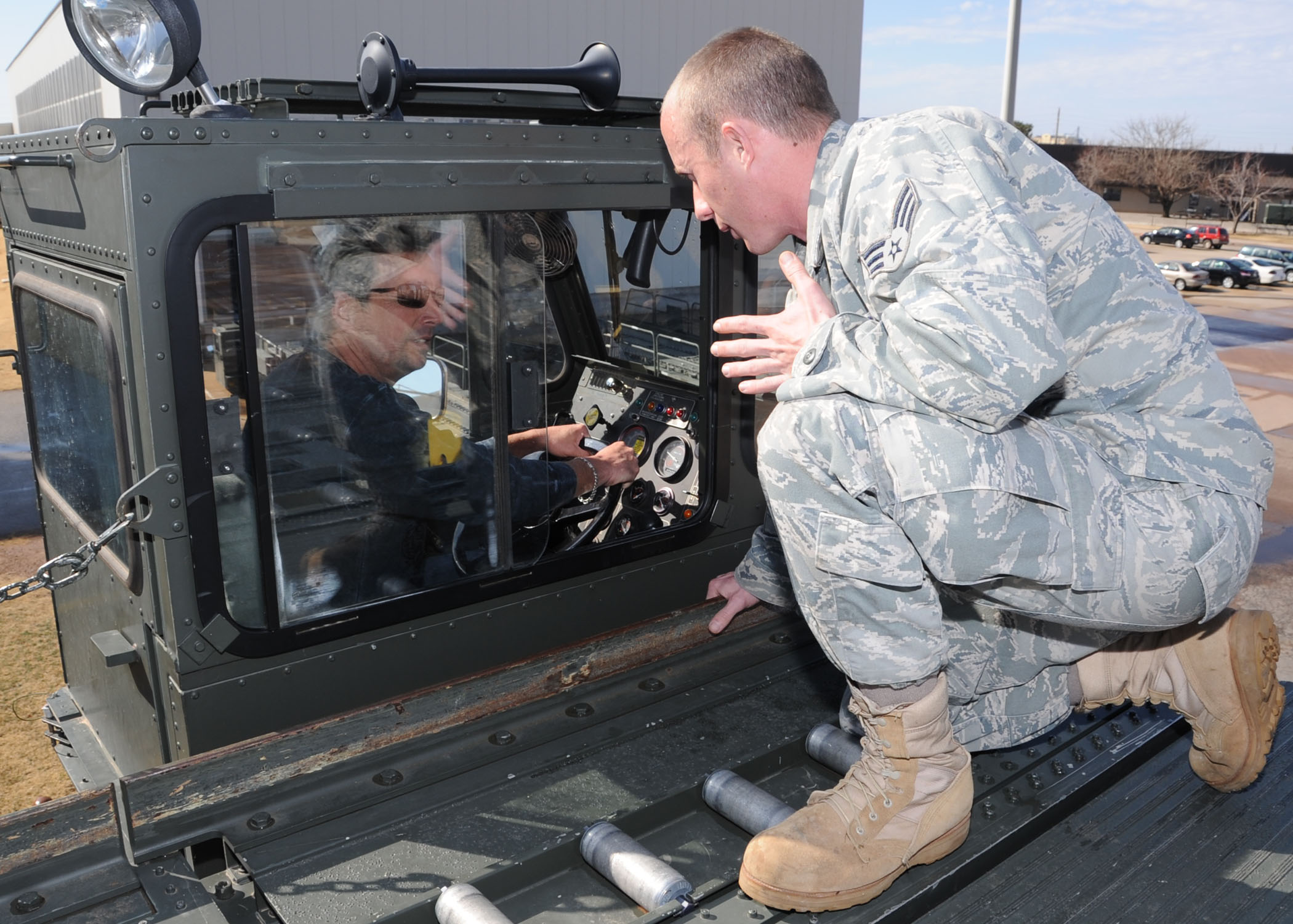 ALTUS AIR FORCE BASE, Okla. – (R) Senior Airman Steven Polachek, 97th Logistics Readiness Squadron air transportation journeyman, explains to Mr. Brett Kelly how to operate a 60K Tunner loader Feb. 24. The loader demonstration was one of several stops during the senior spouse’s tour and taught Air Force spouses more about the 97th Air Mobility Wing mission. (U.S. Air Force photo by Airman 1st Class Christopher Toon/97th Air Mobility Wing- Public Affairs)