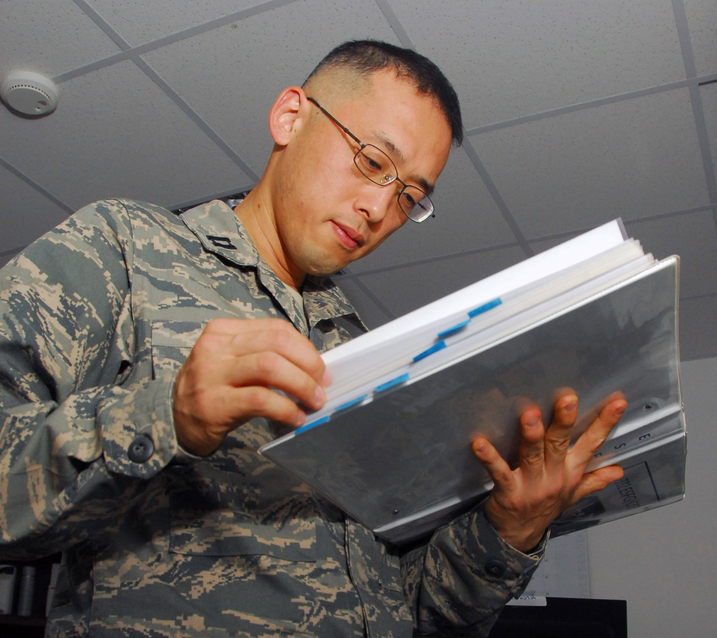 Capt. Ted Kim, 332nd Expeditionary Security Forces Group executive officer, flips through a continuity binder ensuring that the checklists and rosters are up to date Aug 6, 2010, Joint Base Balad, Iraq. It is imperative that every policy letter, checklist, rosters, and phone lists are up to date at all times in case of an emergency. Capt. Kim is a native of Irvine, Calif., deployed from Wright-Patterson Air Force Base, Ohio. (U.S. Air Force photo/Senior Airman Marianne E. Lane)