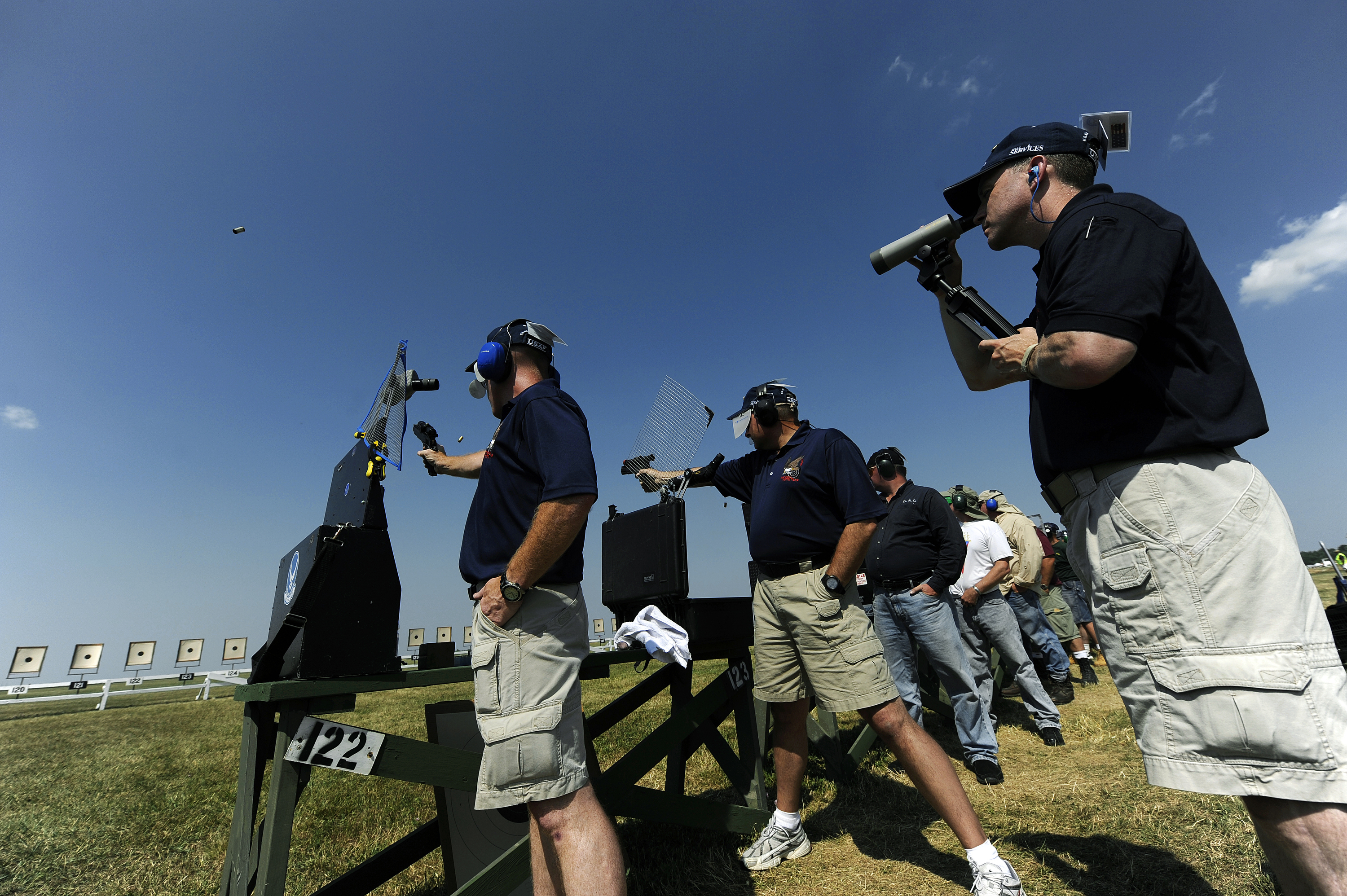 Colonel Mark Teskey, left, and Col. Mark Hays, middle, take shots on target during the Center Fire Team expert .45 caliber competition while Lt. Col. Thomas Reardon, right, provides sight corrections at the 2010 NRA National Pistol Championships July 16 at Camp Perry in Port Clinton, Ohio. (U.S. Air Force photo/Staff Sgt. Bennie J. Davis III)