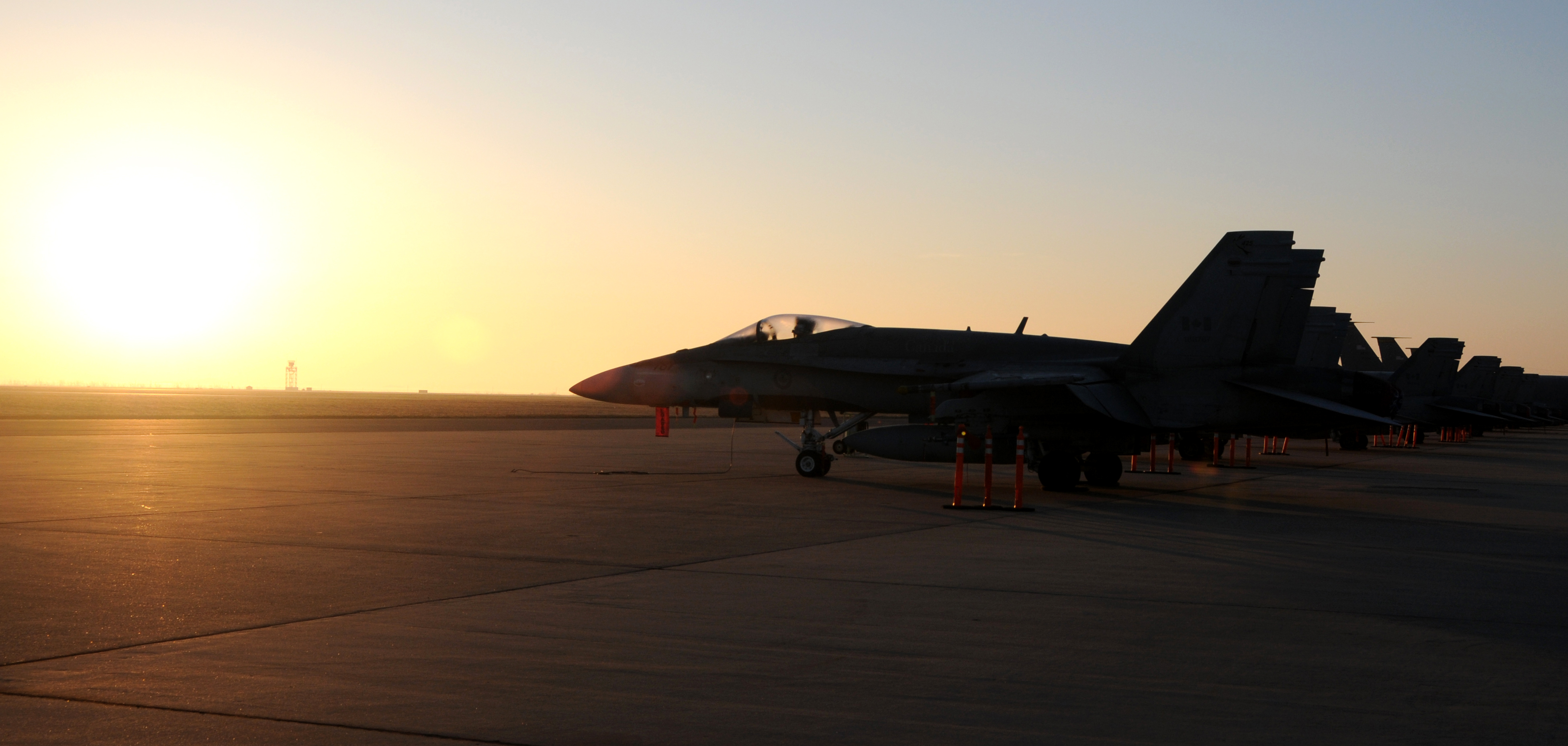 ALTUS AIR FORCE BASE, Okla-- A line of Canadian CF-18 Hornets sits on the flight line during sunrise Mar. 19. These aircraft belong to the 425th Tactical Fighter Squadron, from Canadian Forces Bagotville in Quebec, Canada, who are visiting base for refueling support during a training mission at Fort Sill. The 425th TFS has trained at Ft. Sill since 2006 as part of a 10 week training course for their forward air controllers. (U.S. Air Force photo / Senior Airman Cherice Bryant)