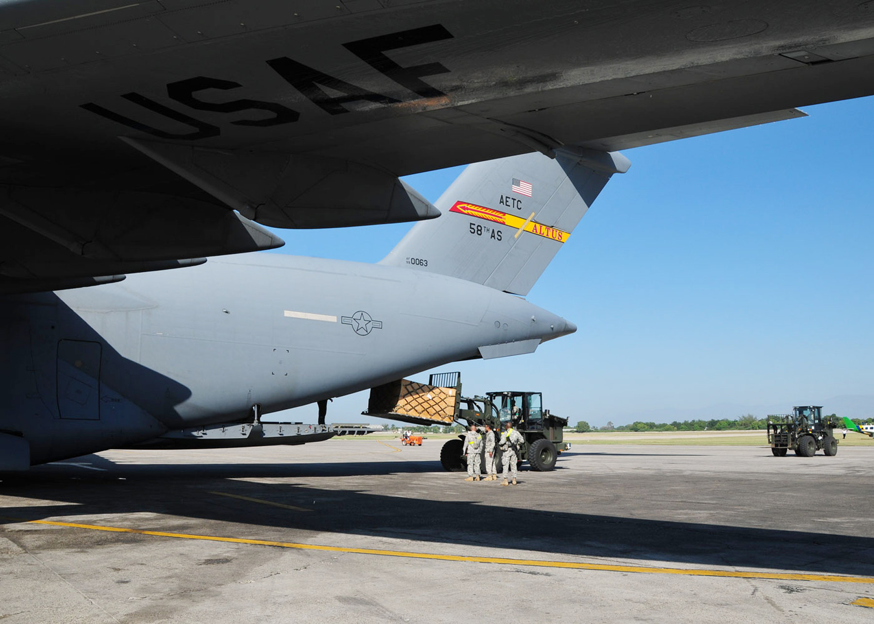 Airmen and Soldiers already on the ground at the Toussaint L'Ouverture International Airport in Port-au-Prince, Haiti assist in offloading vehicles from an Altus Air Force Base, Okla., C-17 Globemaster III Jan. 18, 2010. Altus has six aircraft deployed to Pope AFB, N.C., in support of Operation Unified Response to help Haiti recover from an earthquake. (U.S. Air Force photo/Senior Airman Amanda Bower)