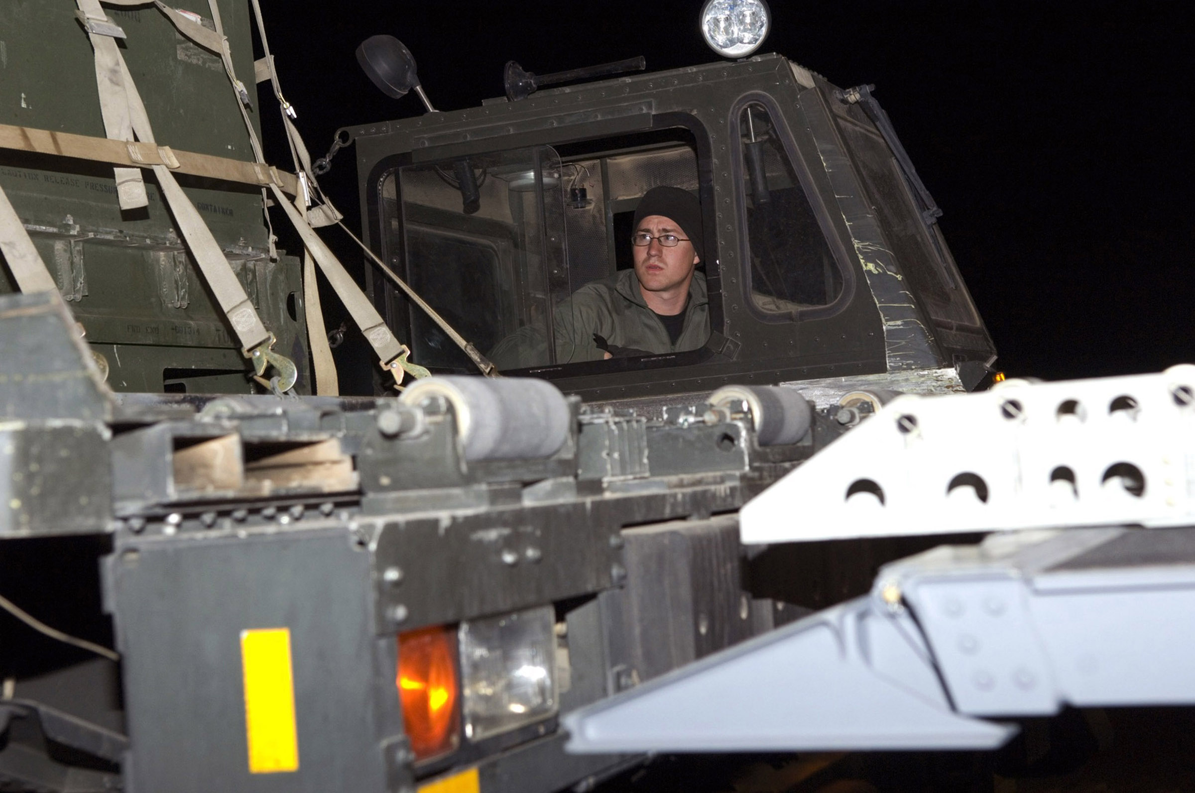 Senior Airman Jeff Johnson watches as the pallets come off the cargo loader onto an aircraft Dec. 8 at Balad Air Base, Iraq. The aircraft cargo loaders can move the cargo forward automatically, completing some of the grueling work often done by the aerial porters. Airman Johnson is a 332nd Expeditionary Logistics Readiness Squadron transportation specialist deployed from Altus Air Force Base, Okla. (U.S. Air Force photo/Staff Sgt. Travis Edwards)