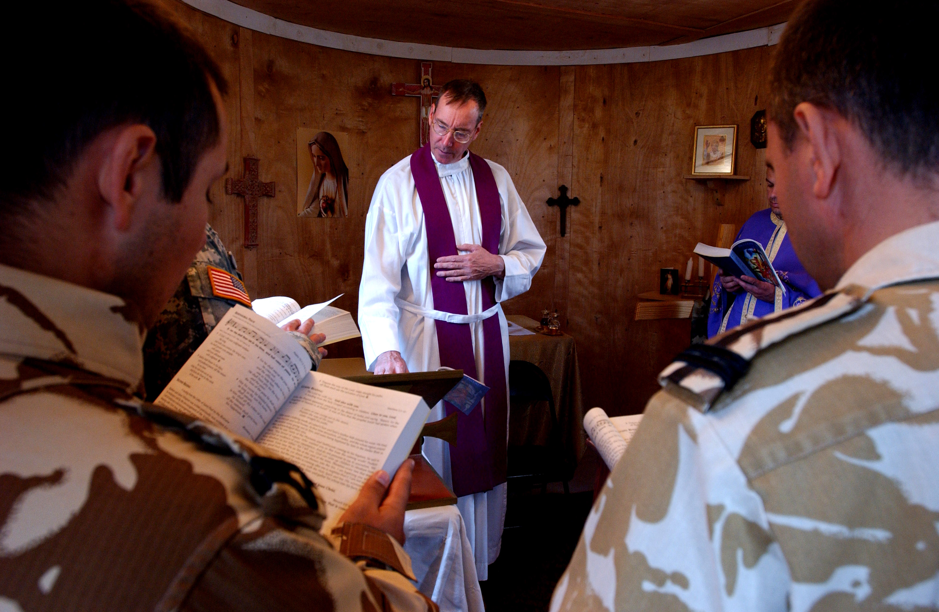 Chaplain (Maj.) Timothy Hirten reads a prayer while Warrant Officer Ionut Gabriel Mittelbrun, left, and Lt. Col. Marian Popa, follow along with the reading Dec. 5 at the Romanian chapel on Ali Base, Iraq. Chaplain Hirten volunteers his time to help lead a Catholic Mass for coalition forces at the Romanian camp. The chaplain is assigned to the 407th Air Expeditionary Group Chapel and is deployed from Altus Air Force Base, Okla. Warrant Officer Mittelbrun and Colonel Popa are both assigned to the Romanian Army. (U.S. Air Force photo/Airman 1st Class Jonathan Snyder)