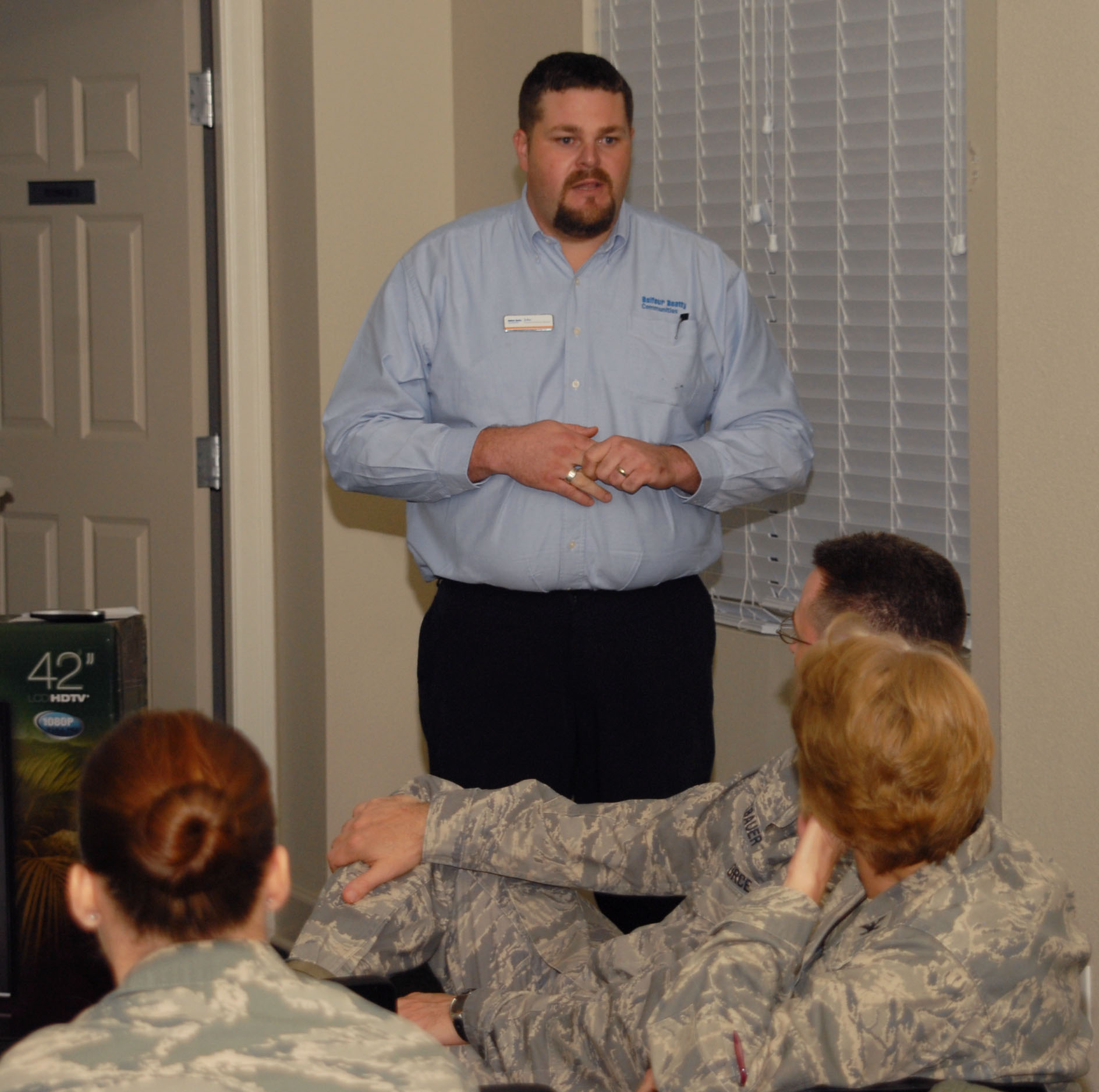 ALTUS AIR FORCE BASE, Okla. - John Menees Assistant Manager &Finance Manager with Balfour Beatty Communities (BBC) discusses issues that were brought up at the BBC town hall meeting on Nov 19. The attendees voiced concerns about the houses, the demolition, reconstruction, the moving process, and how much notice they received before they had to move. (U.S. Air Force Photo/Airman First Class Christopher A. Arnold)