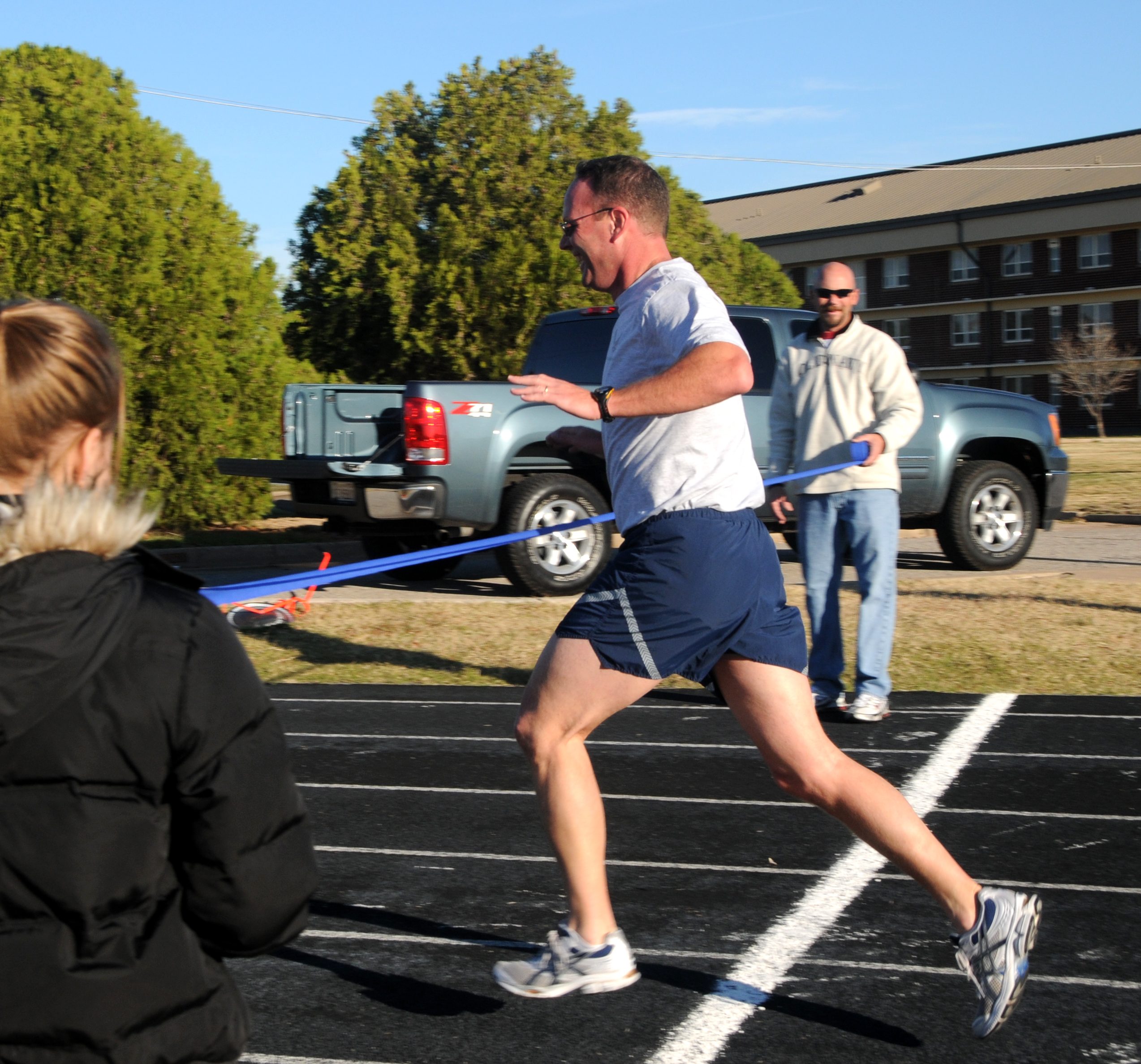 ALTUS AIR FORCE BASE, Okla-- Col. Jon "Ty" Thomas, 97th Air Mobility Wing Commander, runs through the finish line during the Family Fun Run, Nov. 7. The run was a "Year of the Air Force Family" event sponsored by the 97 FSS Fitness Center for Altus AFB personnel and their families. (U.S. Air Force photo/Senior Airman Cherice)