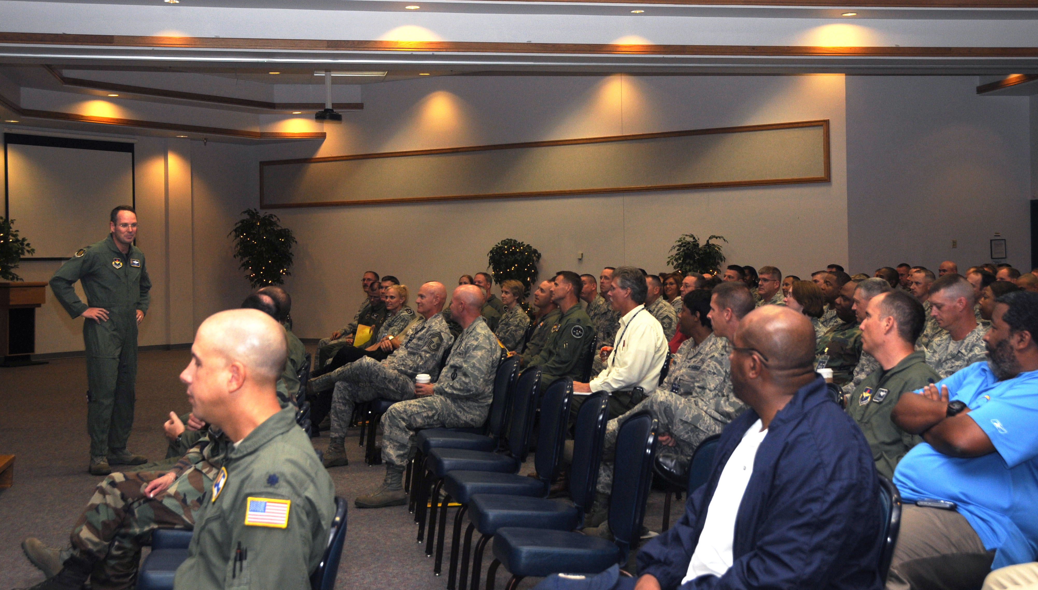 ALTUS AIR FORC E BASE, Okla— Col. Ty Thomas, 97th Air Mobility Wing commander, briefs the Air Education and Training Command Inspector General team just after their arrival on base Sept. 13. The team consists of inspectors from AETC Headquarters and the 19th Air Force who will conduct regulation compliance evaluations throughout the base. (U.S. Air Force photo / Senior Airman Cherice Bryant)