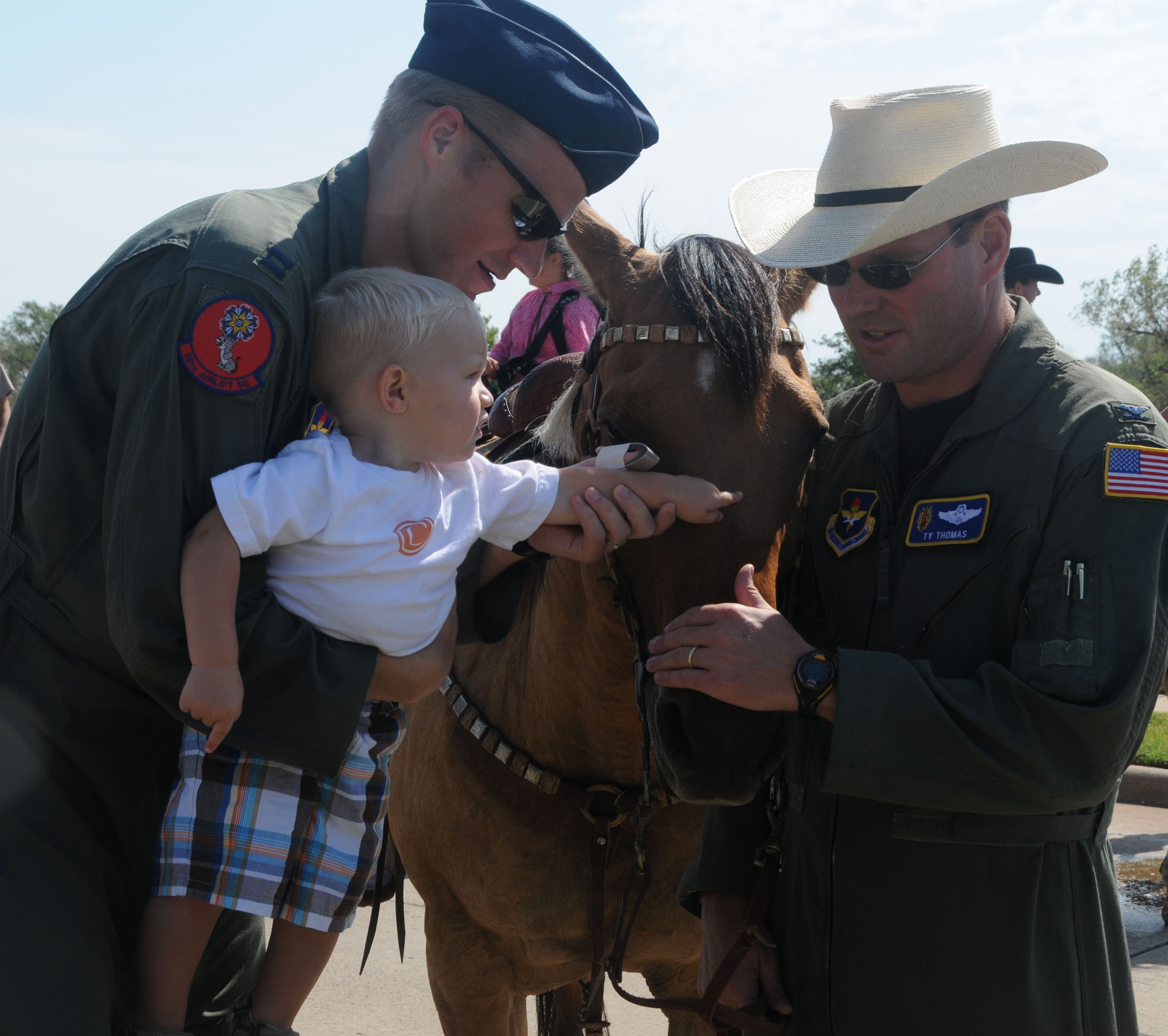 ALTUS AIR FORCE BASE, Okla— Col. Jon “Ty” Thomas, 97th Air Mobility Wing commander, and Capt. Mitch Alley, from the 58th Airlift Squadron, watch as Captain Alley’s son, Cade, pets a horse during the Altus Air Force Base cattle drive Aug. 20. Ranchers from Woodward, Okla., have held this annual event on base for the past nine years. (U.S. Air Force photo / Senior Airman Cherice Bryant)