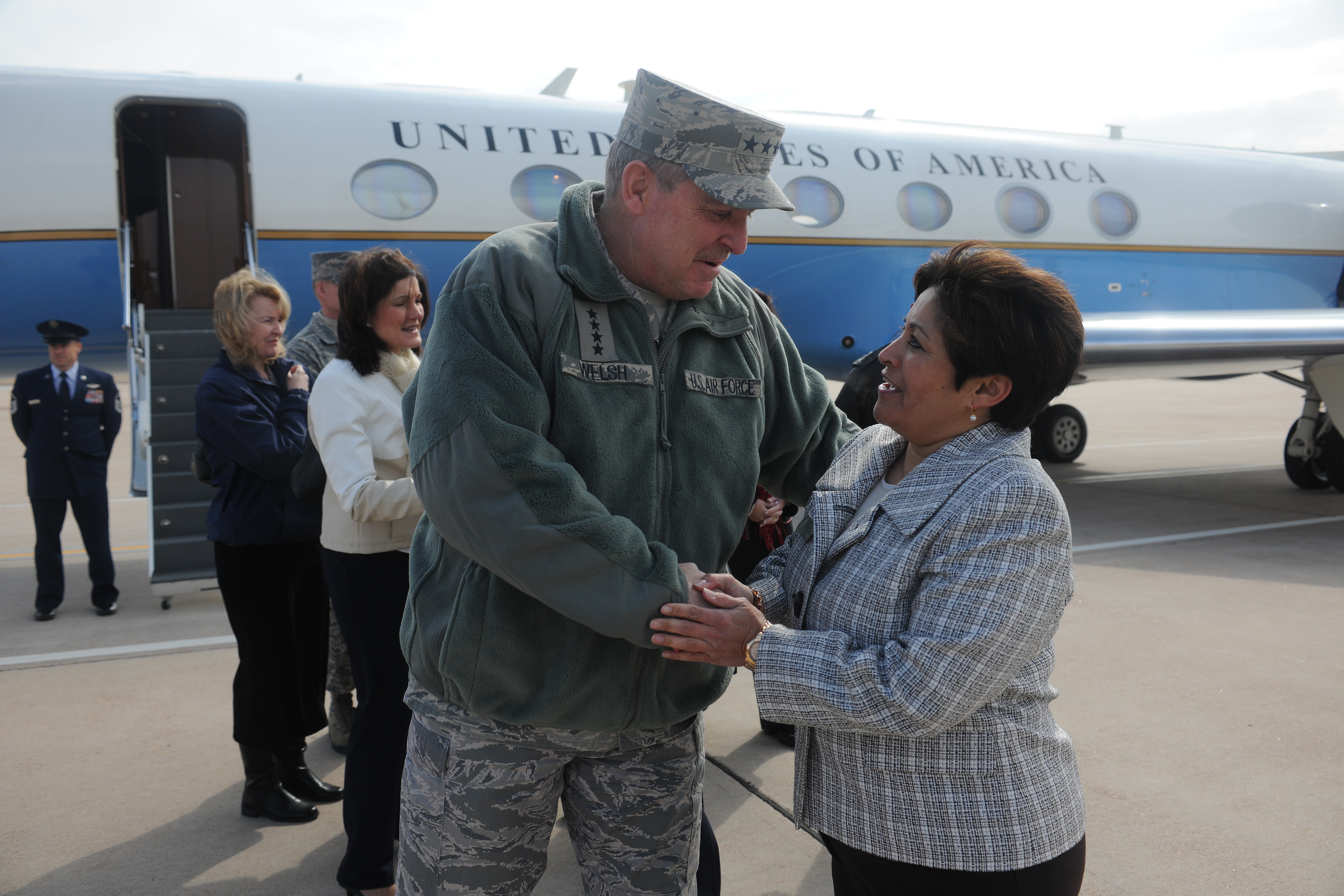 ALTUS AIR FORCE BASE, Okla. – Air Force Chief of Staff Gen. Mark A. Welsh III is greeted by Vickie Burton, 97th Mobility Wing chief of protocol during a base visit, Mar. 5, 2014. Welsh, Chief Master Sgt. of the Air Force James A. Cody, and their spouses, Betty and Athena, visited the base to interact with Airmen, their families and the Altus community. (U.S. Air Force photo by Senior Airman Jesse Lopez/Released)