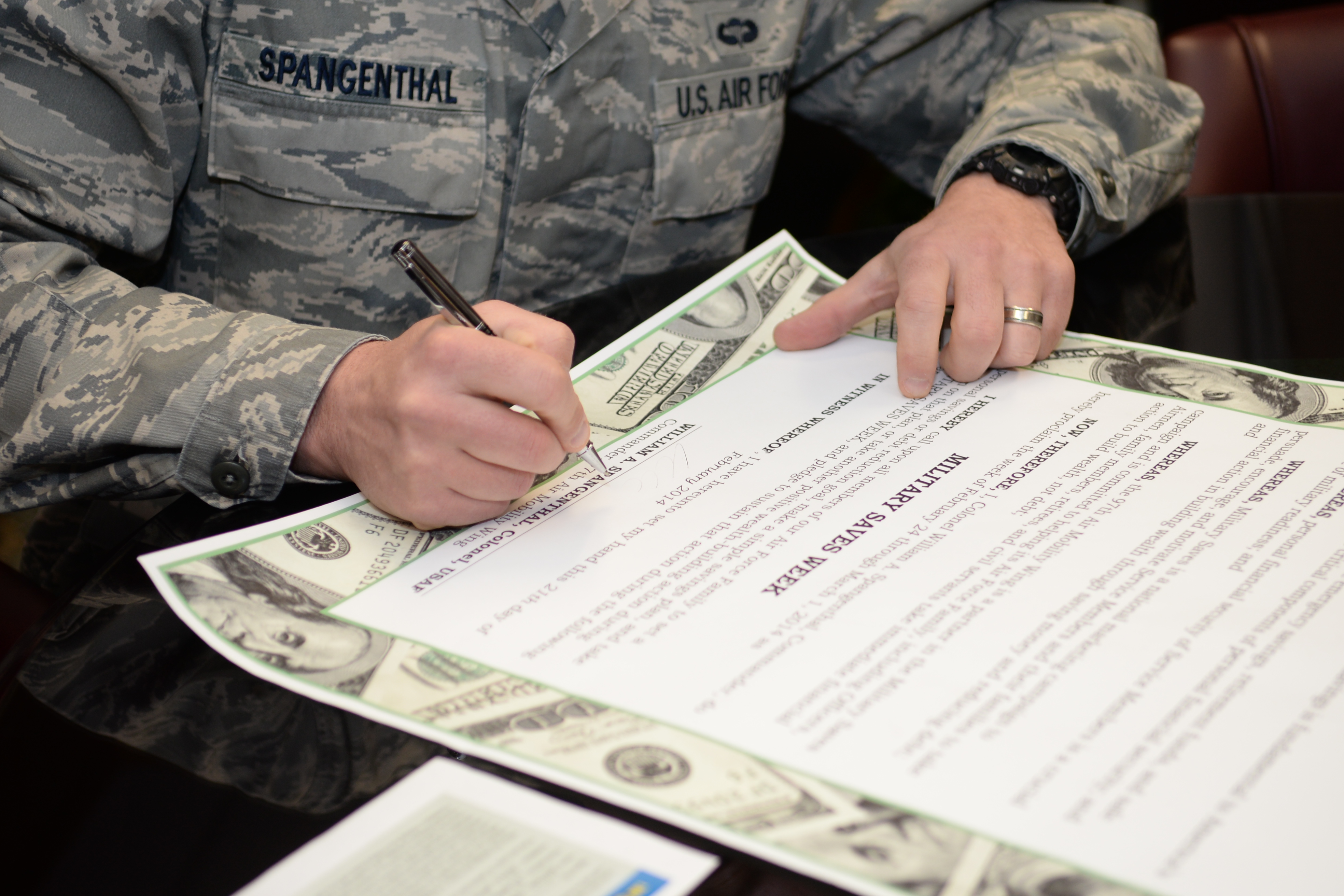 ALTUS AIR FORCE BASE, Okla. – U.S. Air Force Col. Bill Spangenthal, 97th Air Mobility Wing commander, signs the 2014 Military Saves Week proclamation inside the Wing Headquarters building Feb. 21, 2014. The proclamation signifies the beginning of the campaign that aims to help Airmen and family members learn about saving benefits and initiatives. The Airman and Family Readiness Center will be offering classes Feb. 24-28 for base members interested in taking the initiative. Members can contact the AFRC at 580-481-6761 for more information about the classes or to make a pledge. (U.S. Air Force photo by Senior Airman Dillon Davis/Released)