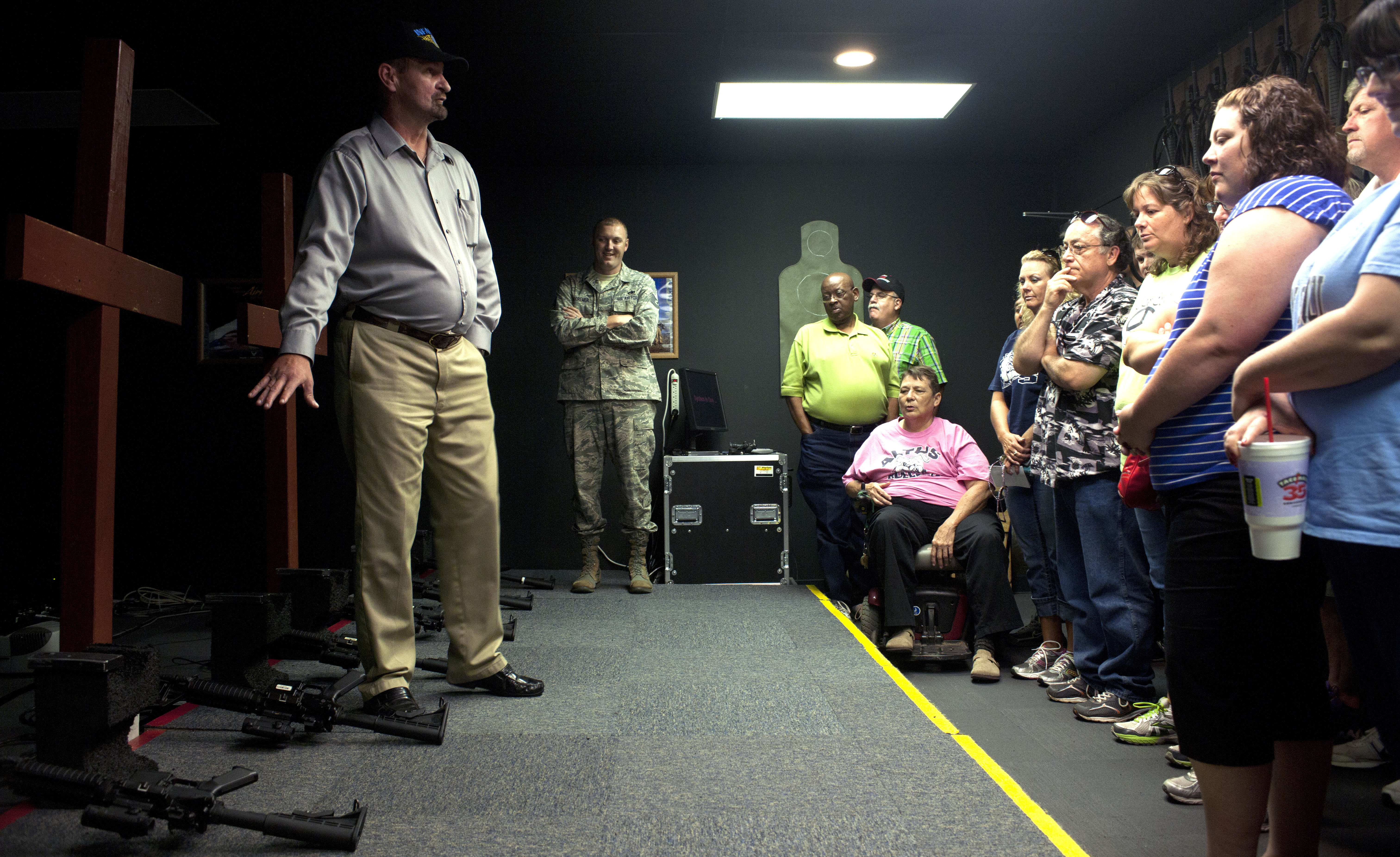 ALTUS AIR FORCE BASE, Okla. – Herbert Estes, 97th Security Forces Squadron expeditionary skills trainer, demonstrates the technology behind the Engagement Skills Trainer 2000 to Altus High School faculty members as part of Science, Technology, Engineering and Mathematics Faculty Development Day, Aug. 8. The tour was held to bring members of Altus High School to the base and teach them about the science, technology, engineering and math aspects of military training around base. (U.S. Air Force photo by Senior Airman Jesse Lopez / Released)